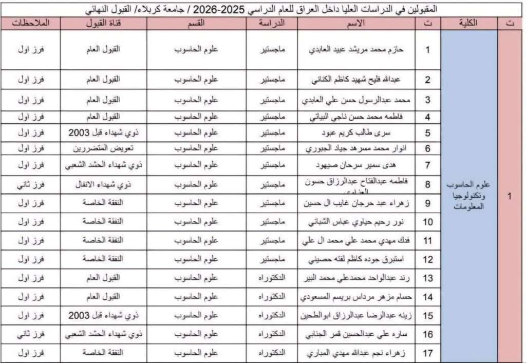 يسرّ كلية علوم الحاسوب وتكنولوجيا المعلومات في جامعة كربلاء أن تعلن عن أسماء المقبولين نهائيًا في برامج الدراسات العليا (الماجستير/الدكتوراه) للعام الدراسي [2025–2026]، وذلك بعد استكمال كافة الإجراءات والتدقيقات من قبل الجهات المعنية.