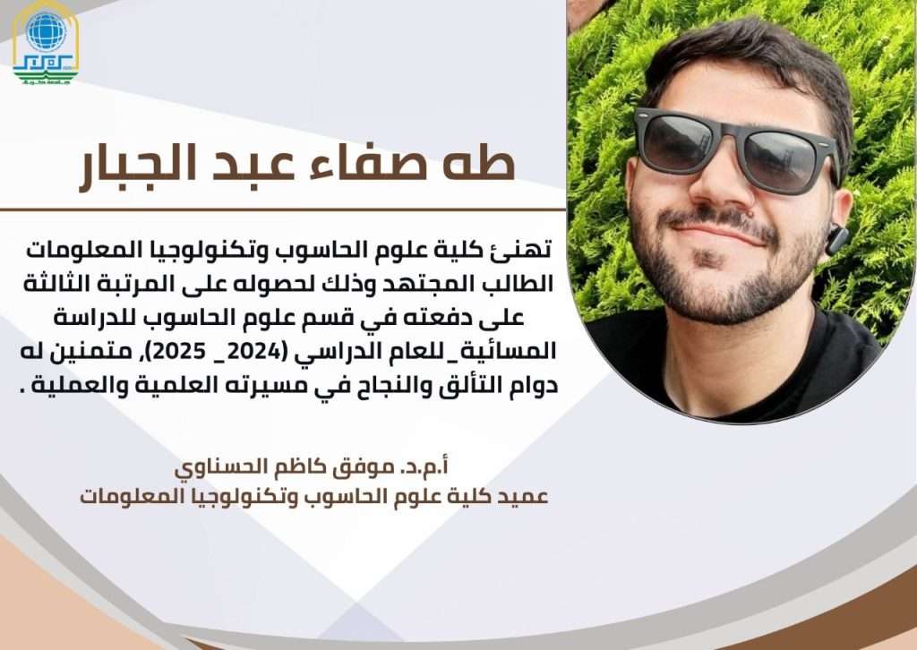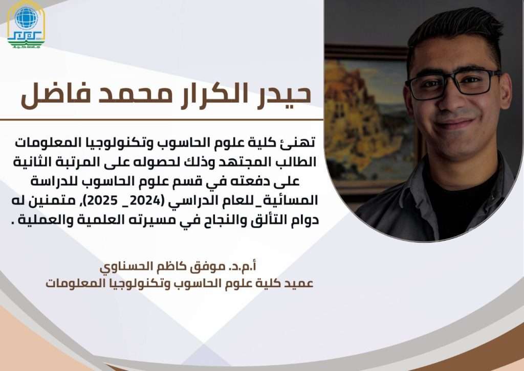 كلية علوم الحاسوب وتكنولوجيا المعلومات في جامعة كربلاء متمثلة بعميدها الدكتور موفق كاظم الحسناوي تتقدّم بأسمى آيات التهاني والتبريكات إلى طلبتها الأعزاء بمناسبة تفوقهم العلمي وحصولهم على المراتب الأولى في قسم علوم الحاسوب – الدراسة المسائية للعام الدراسي (2024 – 2025).