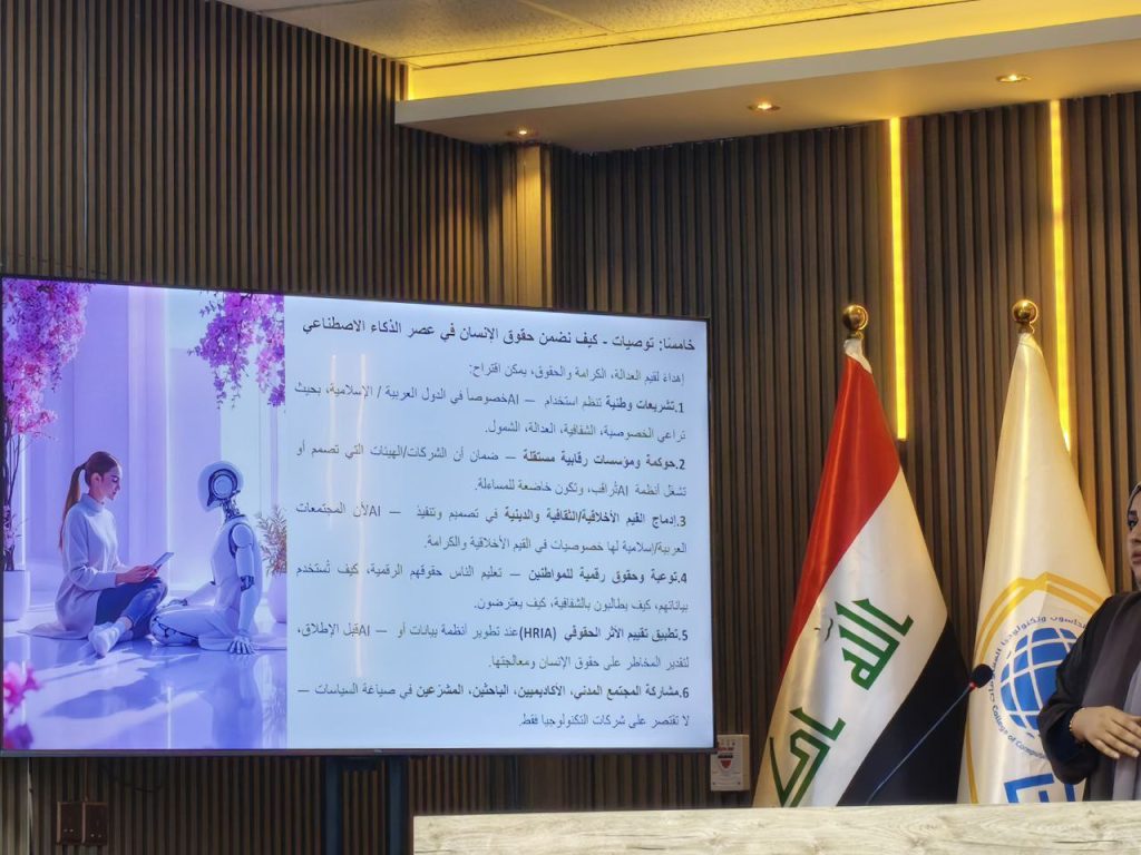 اذ تناولت المحاضِرتان أهم التحديات الأخلاقية والقيمية التي تفرضها تقنيات الذكاء الاصطناعي، ولا سيما في مجالات الخصوصية و حماية البيانات، والتحيز الخوارزمي، إضافةً إلى مناقشة سبل تعزيز الاستخدام المسؤول للتكنولوجيا.