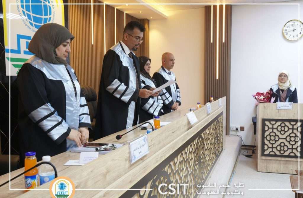 تقدمت بها طالبة الماجستير (زهراء يعرب هاني) وذلك في الساعة التاسعة والنصف صباح يوم الأثنين الموافق 26 / 1 /2026 إذ جرت المناقشة على قاعة الخوارزمي في عمادة كلية علوم الحاسوب وتكنولوجيا المعلومات بحضور السيد العميد الدكتور موفق كاظم الحسناوي وعدد من الباحثين والتدريسيين.