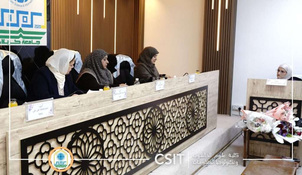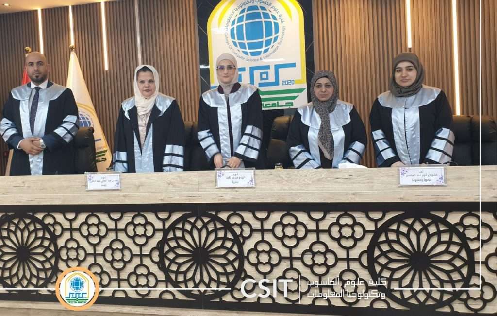 تقدمت بها طالبة الماجستير (صابرين غانم خليفه) وذلك في الساعة التاسعة والنصف صباح يوم الأحد الموافق 15 / 2 /2026 إذ جرت المناقشة على قاعة الخوارزمي في عمادة كلية علوم الحاسوب وتكنولوجيا المعلومات بحضور السيد العميد الدكتور موفق كاظم الحسناوي وعدد من الباحثين والتدريسيين.