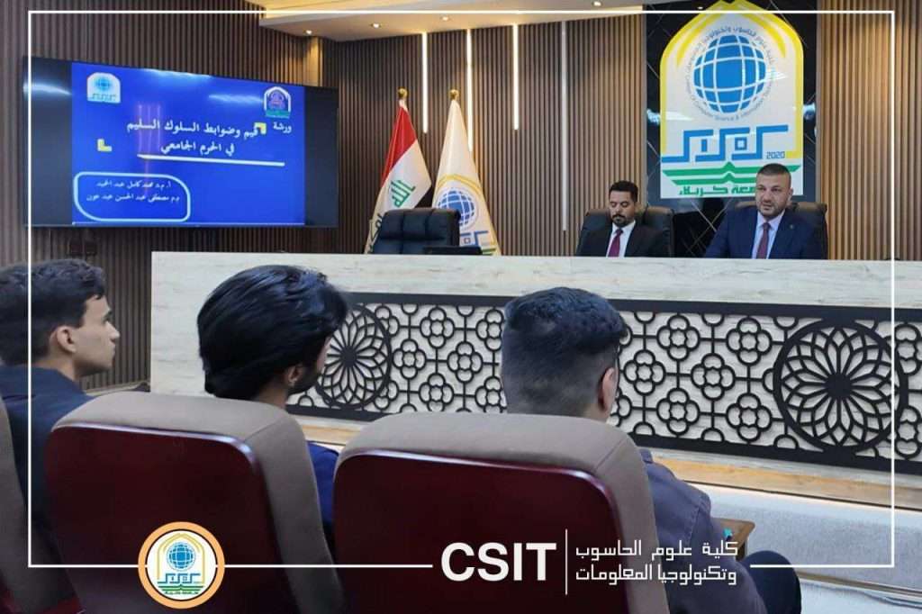 The Psychological Counseling and Guidance Unit at the College of Computer Science and Information Technology organized a workshop titled “Values and Guidelines of Proper Conduct on Campus.” The workshop was presented by the Administrative Assistant, Dr. Muhannad Kamil Abdul-Hamid, and Assistant Lecturer Mustafa Abdul-Hassan Abdul-Awn.