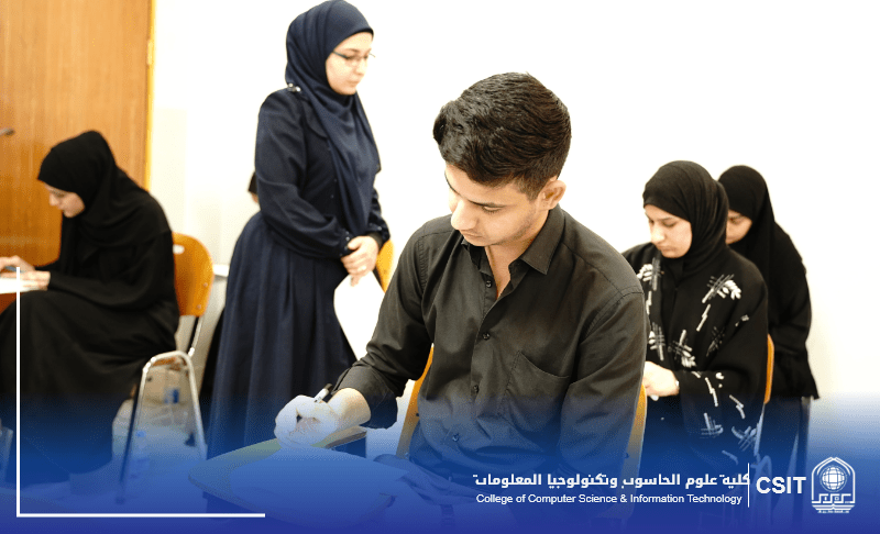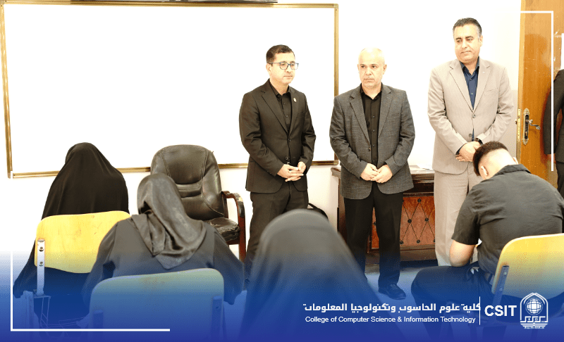 As part of his commitment to ensuring that the educational and academic process proceeds with the highest levels of organization and precision, the Dean of the College of Computer Science and Information Technology at the University of Karbala, Professor Dr. Mowafaq Kadhem Al-Hasnawi, accompanied by the Associate Dean for Scientific Affairs, Dr. Mohsen Hassan Hussein, and the Associate Dean for Administrative Affairs, Dr. Essam Hamed Abbas, supervised the competitive examination for applicants to graduate (Master’s) programs for the academic year 2024–2025.